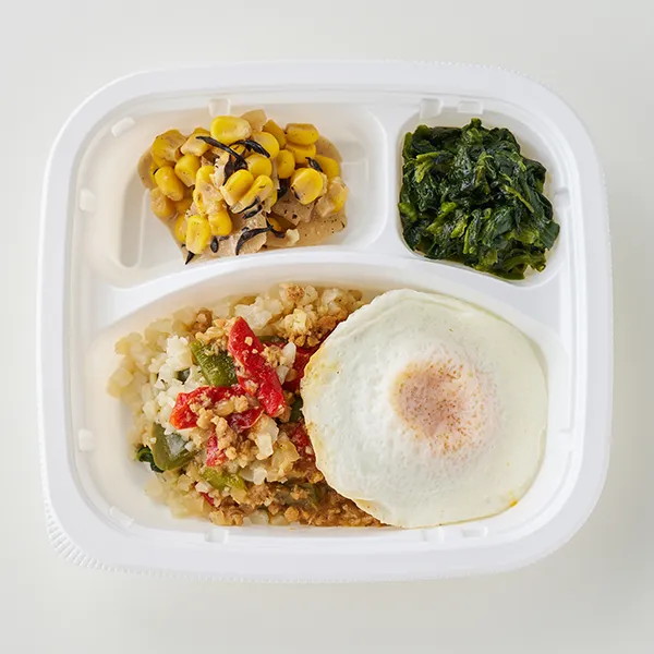 カリフラワーガパオライス(カリフラワーライス(ポルトガル)、豚肉加工品、赤ピーマン、ピーマン、玉ねぎ、オイスターソース、食用調合油、ニンニク、ナンプラー、醤油、上白糖、清酒、生姜、黒コショウ、鷹の爪、ホーリーバジル)、蓮根・ひじき・コーンのサラダ(コーン、れんこん水煮、半固体状ドレッシング、醤油、食用調合油、ハチミツ、ひじき)、目玉焼き風オムレツ(液卵、デキストリン、還元水あめ、植物油脂、こんぶだし、ゼラチン、食塩、酵母エキスパウダー)、ほうれん草のバターソテー(ほうれん草、食用調合油、コンパウンドバター、食塩、白コショウ)/加工澱粉、pH調整剤、調味料(アミノ酸等)、増粘剤(加工澱粉、増粘多糖類、アルギン酸Na)、着色料(カラメル、カロチノイド)、酸化防止剤(V.C)、リン酸塩(Na)、香料、乳化剤、漂白剤(亜硫酸塩)、香辛料抽出物、(一部にえび・小麦・卵・乳成分・ごま・大豆・豚肉・りんご・ゼラチンを含む)