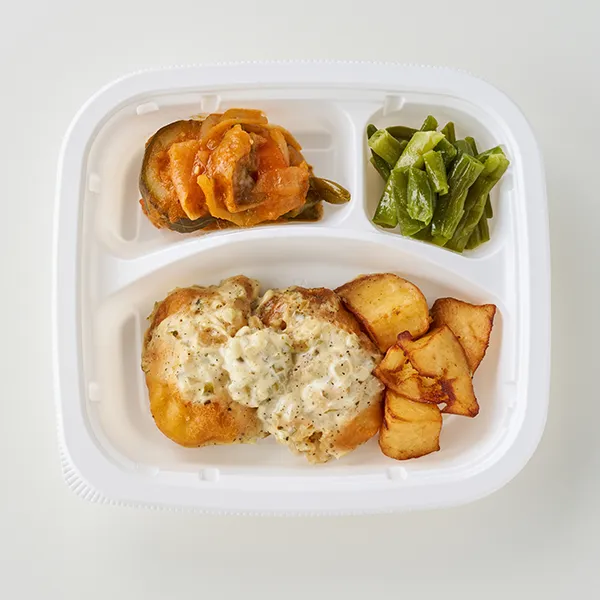 フィッシュアンドチップス(冷凍魚フライ(すけそうだら、揚げ油(パーム油)、小麦粉、コーンフラワー、植物油脂、還元水あめ、食塩、粉末卵白、香辛料、粉末状植物性たん白)(中国製造)、ゆでじゃがいも、半固体状ドレッシング、食用大豆油、きゅうり、玉ねぎ、砂糖・ぶどう糖果糖液糖、オリーブオイル、レモンジュース(濃縮還元)、ニンニク、食塩、醸造酢、黒コショウ、ドライパセリ、香辛料)、ラタトゥイユ(玉ねぎ、グリルズッキーニ、揚げ茄子、トマトソース、にんじん、トマトケチャップ、白ワイン、食用調合油、オリーブオイル、ハチミツ、乾燥スープ(コンソメ)、ニンニク、粉末調味料、食塩、ローレル)、インゲンソテー(インゲン、香味食用油、食塩、白コショウ)/調味料(アミノ酸等)、膨張剤、酸味料、増粘剤(増粘多糖類、加工澱粉)、香辛料抽出物、着色料(ウコン、カラメル、カロチン)、明礬、塩化Ca、フィチン酸、香料、加工澱粉、貝Ca、クエン酸(Na)、炭酸Na、重曹、乳化剤、(一部に小麦・卵・乳成分・牛肉・大豆・鶏肉・りんご・ゼラチンを含む)