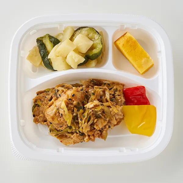 豚ロース肉と長葱のコチュジャン炒め(豚肉加工品(国内製造)、ねぎ、果糖ぶどう糖液糖、食用調合油、清酒、白ごま、黒ごま、水あめ、アミノ酸液、りんご果汁、コチュジャン、食塩、蜂蜜、唐辛子、みそ、にんにく、ごま油、ガーリックパウダー)、ズッキーニとじゃが芋のマリネ(ゆでじゃがいも、グリルズッキーニ、醤油、オリーブオイル、黒コショウ)、だし巻き玉子、赤パプリカ、黄パプリカ/加工澱粉、増粘剤(増粘多糖類、加工澱粉)、pH調整剤、調味料(アミノ酸等)、着色料(カラメル、パプリカ色素、紅麹)、酸味料、甘味料(アセスルファムK、スクラロース)、(一部に小麦・卵・ごま・大豆・豚肉・りんごを含む)