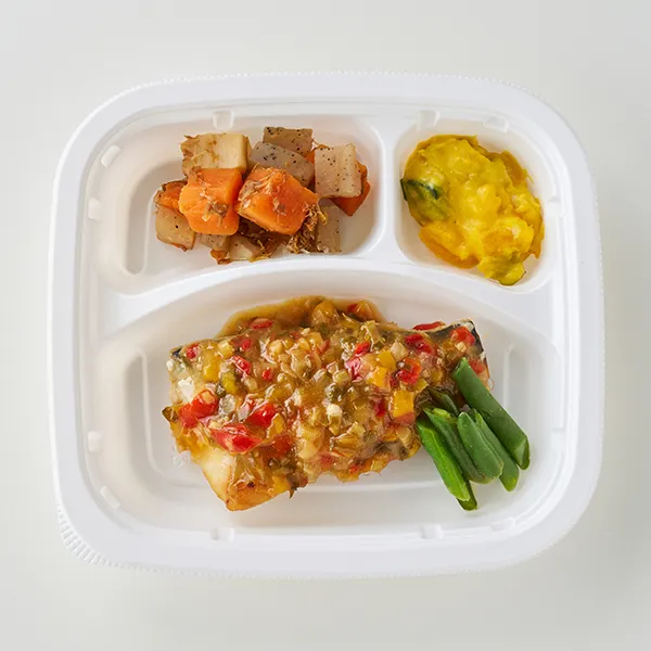 サバの香味野菜のソース(さば(ノルウェー)、ねぎ、赤ピーマン、黄ピーマン、醤油、食用調合油、生姜、三温糖、黒酢、ニンニク)、人参・筍・こんにゃくの土佐煮(にんじん、こんにゃく、たけのこ水煮、醤油、上白糖、鰹節)、南瓜とナッツのハニーサラダ(かぼちゃ、カシューナッツ、ヨーグルト、ハチミツ、半固体状ドレッシング、オリーブオイル、食塩)、インゲン/安定剤(加工澱粉、増粘多糖類)、増粘剤(増粘多糖類、加工澱粉)、pH調整剤、水酸化カルシウム、調味料(アミノ酸)、香料、香辛料抽出物、(一部に小麦・卵・乳成分・カシューナッツ・ごま・さば・大豆・りんご・ゼラチンを含む)